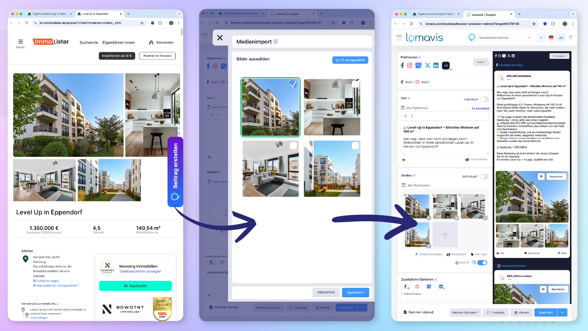 Das Plugin analysiert beim Aufruf automatisch den Inhalt einer geöffneten Webseite und identifiziert relevante Textabschnitte wie Blogbeiträge, Artikel oder Immobilienexposés. Anschließend wird daraus ein Social-Media-Beitrag generiert, der plattformgerecht aufbereitet ist. Enthalten sind optimierte Formulierungen sowie ergänzende Hashtags oder Emojis, um die Reichweite und Ansprache zu verbessern.